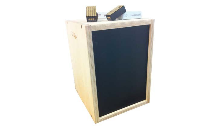 - Leveres i en standard dimensjon tilpasset 15 m innendørs miniatyrskytebaner (kaliber .22 LR) med elektroniske skiver.